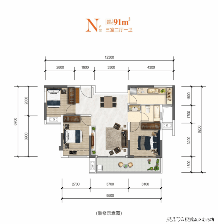 。 - 独立入户:归家时,既充满仪式感又兼具实用功能性。 - 场景阳台:与约6.8米宽景阳台无缝对接,休闲生活模式随意切换。建筑面积约91㎡的户型,同样是三室两厅一卫: - 精致舒居:凭借极致数据设计,让您坐拥城市花园景观,畅享惬意生活。 - 归家仪式:高级入户设计,将仪式感与功能性完美融合。 - 环绕赏景:突破传统边界,客厅与卧室双阳台对接近6.8米长宽景阳台,最大程度保障采光和观景效果。 - 光影起居:全明卫套房,满足主人便捷居家的各种需求