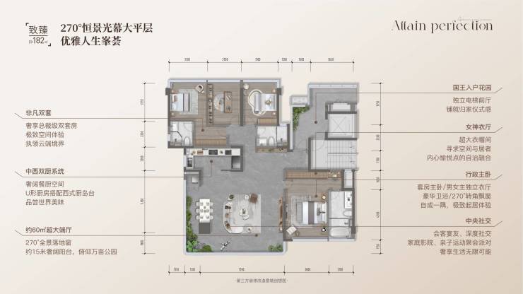 建面约 182㎡的户型为四室两厅三卫,户型设计更为宽敞舒适,为追求高品质生活的家庭提供了更充裕的居住空间。