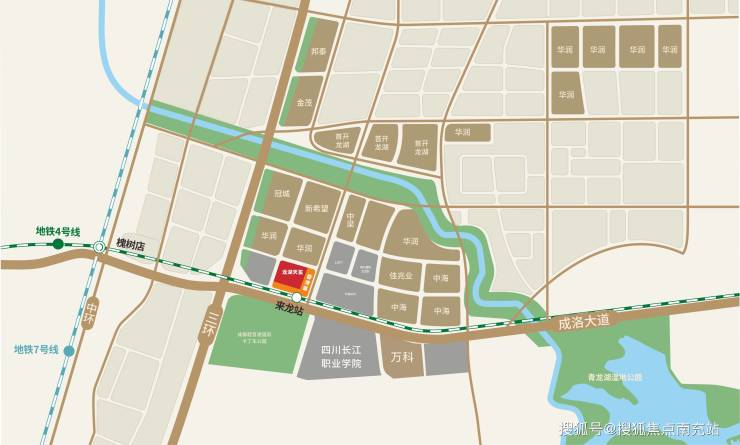 ### 全维配套,畅达中环该项目与地铁 4 号线来龙站直线距离约 50 米,交通优势一目了然。乘坐地铁 1 站就能直达黄金中环槐树店站,2 站可迅速连接成都知名商圈——万象城商圈,5 站便能抵达春熙路商圈。不仅如此,周边的攀成钢、建设路商圈也近在咫尺,可轻松畅享繁华。而且,远期还有 32 号线的规划,未来将尽享全城的繁华盛景。### 全维配套,出行高效项目拥有两横两纵的干道交通体系,极大提升出行效率。“两横”分别是成洛大道与沪蓉高速;“两纵”则为三环路和绕城高速。出门即可上三环,快速出行毫无压力。此外,成都东站就在附近,而十陵南站前置拆迁动迁会也已正式举行。同时,地铁环线的存在,将天府国际机场与成都双流国际机场紧密相连,让出行变得高效便捷,为生活和事业全面提速。### 全维配套,主城生态湖居典范项目周边生态资源极为丰富。约 3 万亩的青龙湖湿地公园步行即可到达,东风渠廊道近在咫尺,驱车十分钟就能抵达成都大运村,居民可随时享受生态之美,时刻被鲜氧环绕,负氧离子滋润日常生活。青龙湖湿地公园在整个绕城生态带中颇负盛名,被誉为“城市绿肺”。其总占地面积达 30000 亩,其中湖域面积多达 4000 亩,规模相当庞大,相当于 4 个锦城湖、21 个东湖大小。在这里,人们可以尽情露营、骑车、跑步、赏花,享受亲近自然的惬意时光。东风渠廊道 - 市民体育公园独具特色,巧妙地将运动体验与生态自然融为一体。在滨水绿地之中,精心布局了各类体育运动场景以及休闲服务设施,满足居民多样化的运动和休闲需求。成都大运村专为 2023 年第 31 届世界大学生夏季运动会而建,是运动员们的居住之所。这里集住宿、餐饮、健身、娱乐和医疗保障等多种功能于一身,见证着青春的活力与拼搏。### 全维配套,优质教育资源汇聚教育资源方面,树德中学领办华川中学,优质教育资源的注入,有力地提升了板块价值。周边还有成都大学附属幼儿园(直线距离 1.8KM,公办),它由龙泉驿区教育局和成都大学共同举办,是一所全日制公办幼儿园,为孩子们提供了良好的启蒙教育环境。成都大学附属小学(直线距离 3.6KM,公立)也备受关注,这是由龙泉驿区人民政府举办,成都大学领办的“两自一包”“校地共建”公立小学,致力于为学生提供高质量的教育服务 。 ### 全维配套·健康护航在医疗配套方面,项目周边医疗资源丰富,3KM 范围内有三大三甲医院,全方位守护家人的健康生活。其中,成都大学附属医院为三级甲等医院,直线距离约 3.3KM,它还是全国首批住院医师规范化培训基地。第六人民医院东虹院区同样是三级甲等医院,直线距离仅 1.4KM,荣获“四川省十佳城市医院”的称号。四川省人民医院东院也是三级甲等医疗机构,直线距离 2.2KM,这是一所集医疗、教学、科研、急救、预防保健、康复等多种功能于一体的公立“三级甲等”医院。此外,教育资源也有重大利好消息。成都树德中学将领办华川中学,两所学校直线距离仅 1.5KM,华川中学为公立学校。领办后,将达成课程资源、教学资源、教师资源的“三同步三共享”,进一步提升区域教育水平。