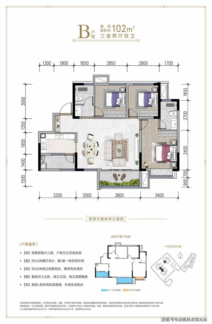 建面约102平套三