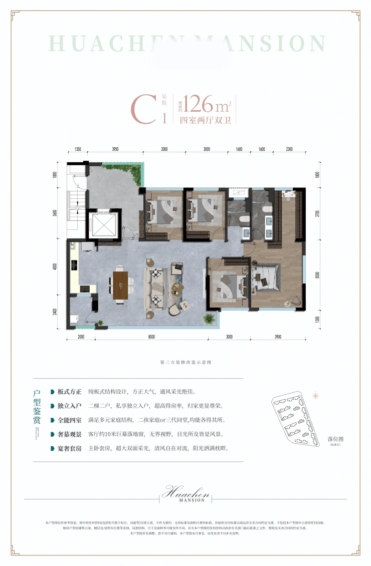 2. 126㎡四室两厅两卫,纯板式南北通透格局,LDK一体化大通厅设计让公区更显开阔,入户光厅拓展实用空间。双卫明窗设计,卧室尺度均好,整体空间舒展大气,适配二胎或三代同堂家庭。