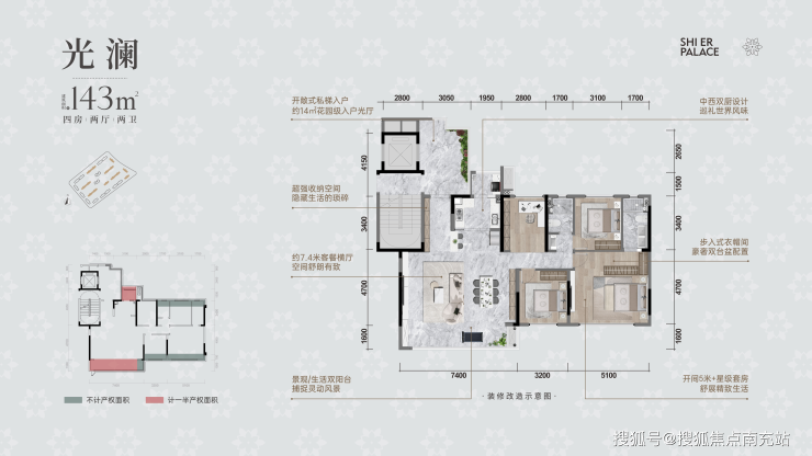 在户型设计上,中铁拾贰宸同样亮点纷呈。建面约129㎡的户型以四房两厅双卫的布局,提供了宽敞的居住体验。开敞式私梯入户和全明入户花园设计,不仅提升了归家的仪式感,还额外提供了生活物品的收纳空间。建面约143㎡的户型则进一步强化了居住的奢华感,通过超大花园入户光厅和一体化豪奢横厅,为业主提供了广阔的生活空间。而建面约175㎡的户型更是堪称典藏级楼王,以其270°无界视野和约14米环幕端厅,展现了极致的观景体验。