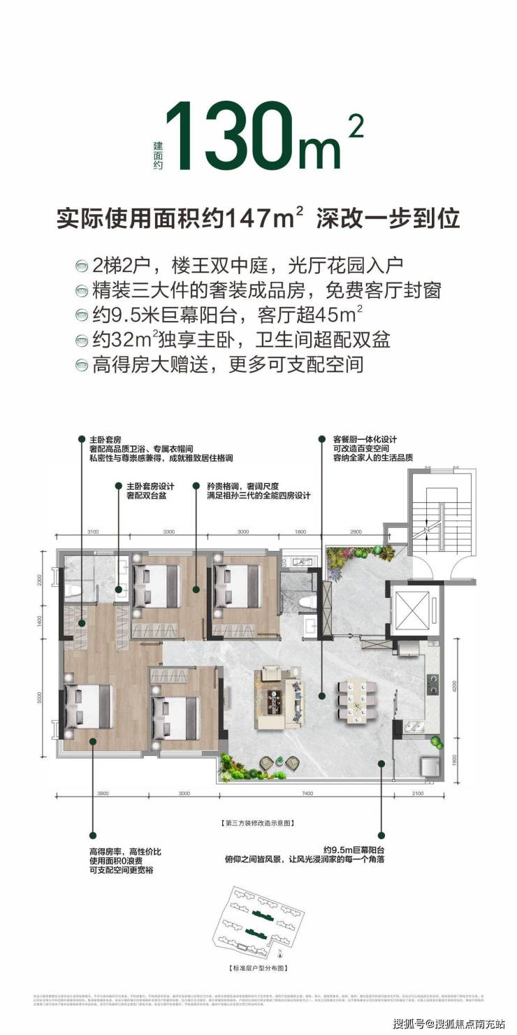 中空low-E玻璃+现代轻奢风水包砂外立面+业主会所室内恒温泳池+健身房+大面积高端石材入户大堂+仿石地砖公区过道+星空屋车库单元入户厅+全新水磨石地面+全屋交付柜体+全免费封窗。