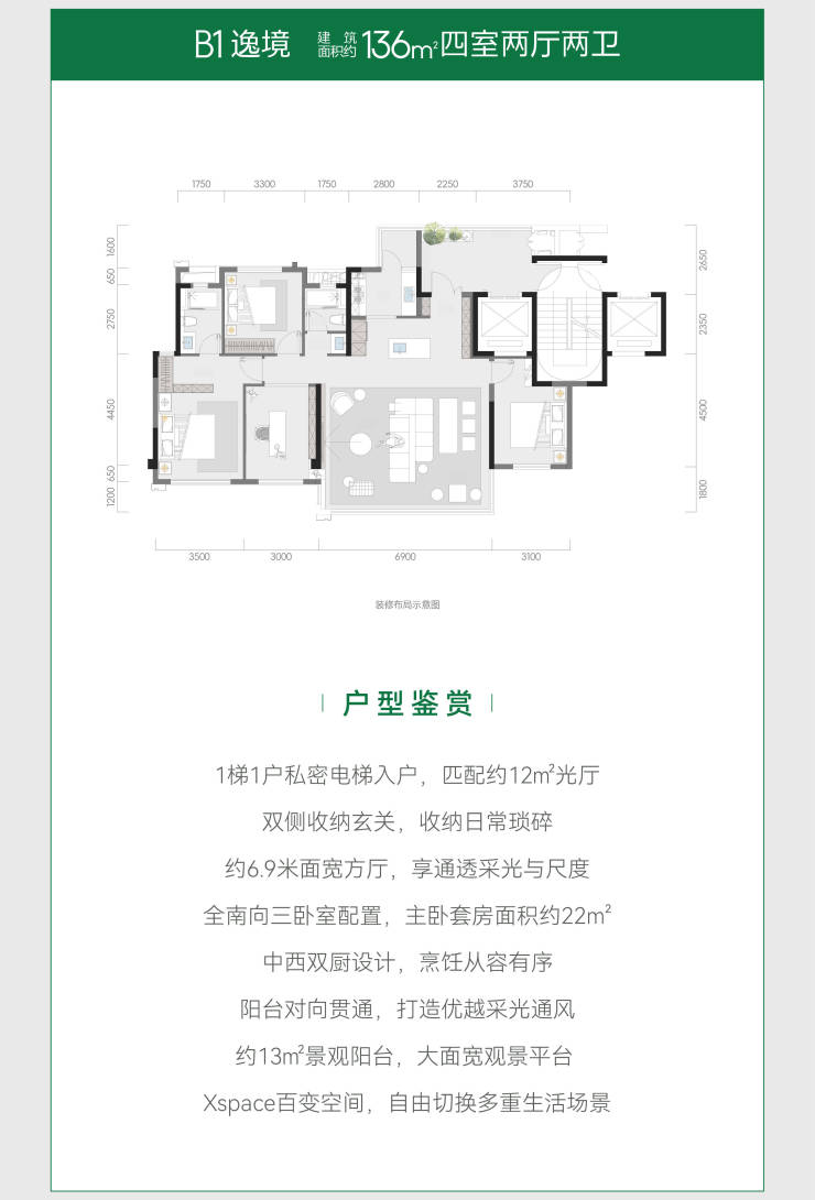 户型设计出色:主力户型为建面约109平方米和136平方米的房源。其中,109平方米户型为一梯两户,得房率高,有独立入户光厅和横厅设计;136平方米户型为两梯两户,有270度转角环幕采光面的观景方厅和洄游式社交厨房,居住舒适度高。