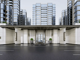 建筑外立面采用香槟金铝板、高透 Low-E 玻璃与定制金属型材,以公建化标准勾勒现代轮廓,全玻璃楼冠形成区域视觉焦点。