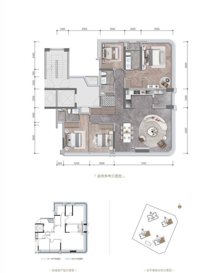 布局科学:主卧 3.5 米面宽,19㎡空间带独立衣帽间 + 明卫(干湿分离),动静分区清晰;三个次卧面积分别为 10.2㎡、9.5㎡、9.0㎡,无紧凑感,适配二孩家庭或三代同堂居住;