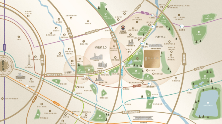 5. 全维顶配成熟配套:①交通:7/8/17号线三地铁环绕,中环/三环快速路;②教育:七中英才+石室中学+树德领办学校,全龄名校;③商业:3公里内万象城/滨江天街/东郊记忆,比三圣乡配套成熟10年;④医疗:2所三甲医院护航