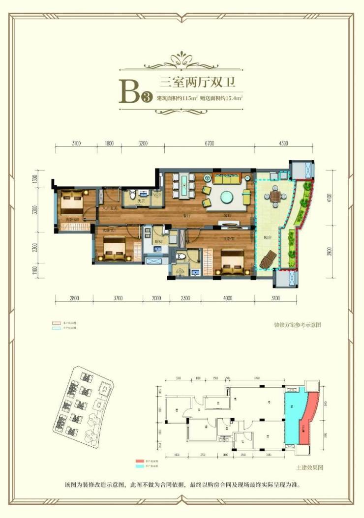三层:115㎡三居(161万,27㎡观景露台)