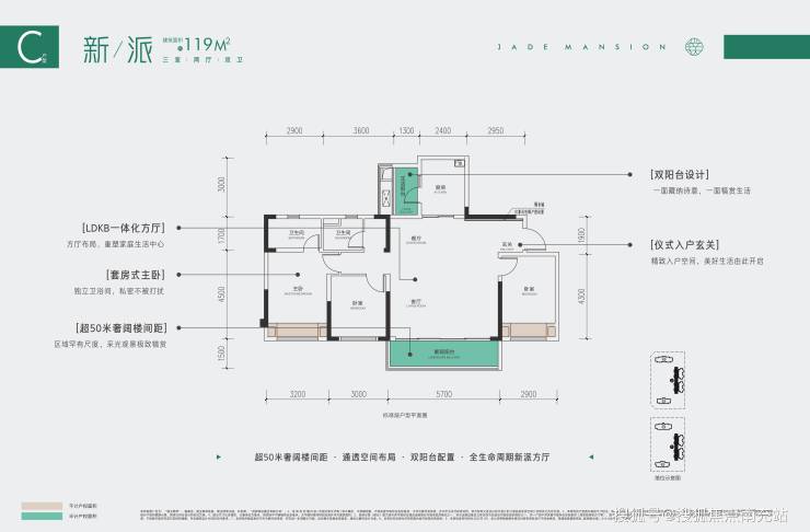 C户型 119㎡三室两厅双卫:现代格局,舒适尺度