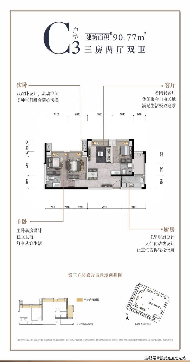 - **90㎡三房**:主卧采用套房设计,提升居住的私密性与舒适性。