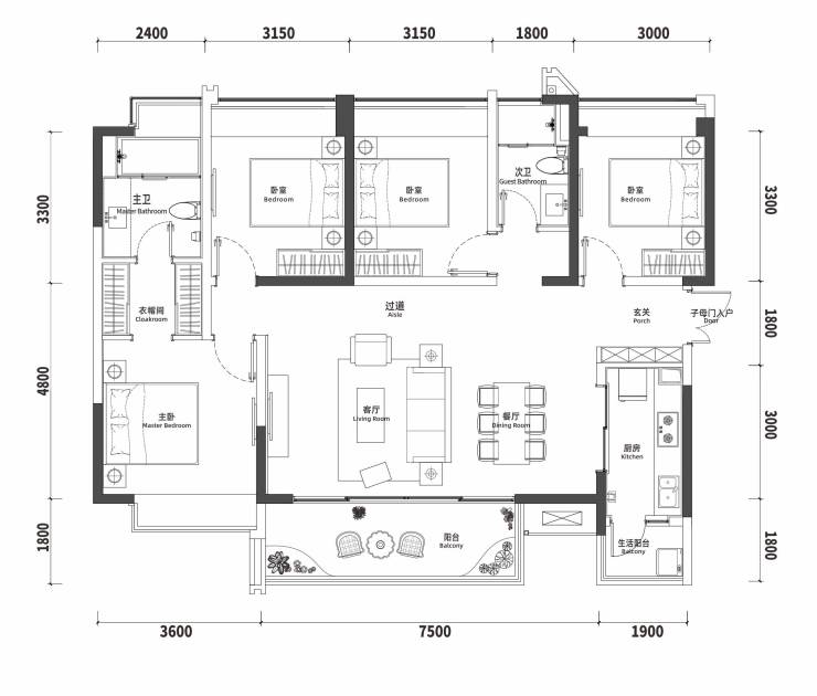 K2项目推出建面约159㎡的户型,为四室两厅两卫的设计格局