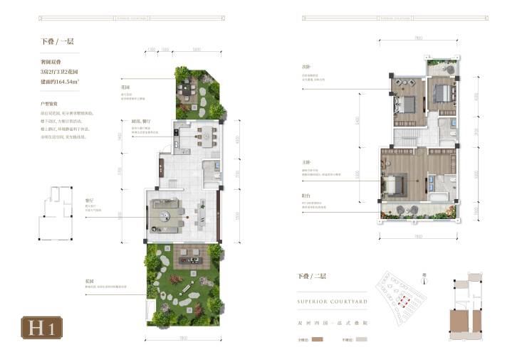 上叠(三层):建筑面积约212平米,星空大露台,上中下三层,空间灵活,私密主卧独享花园。