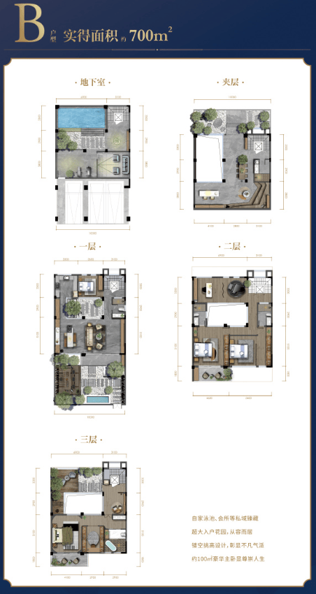 B户型 建面约383㎡ 实得面积约700㎡ 层联排合院