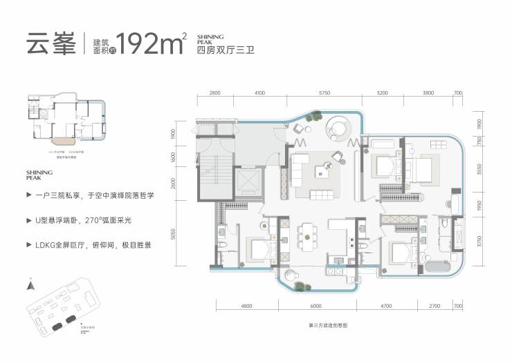 5.产品设计高端:建筑采用领创成都的双曲铝板工艺,窗墙比达74%,外观时尚且具地标感。园林以神秘山谷Shangri-la为灵感,打造六重归家臻境。户型为建面约192-300㎡的大平层,整盘可售套均面积超230㎡,300㎡户型一层一户,精装配置嘉格纳厨电、劳芬浴缸等国际高端品牌。