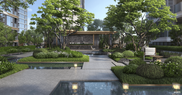 中庭核心景观:保留大面积的中央庭院水景,形成层次丰富的互动空间,将园林景观体验最大化。
