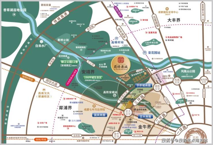 ### 【都会生活圈】立体交通网·醇熟配套#### 交通枢纽蜀绣康城交通极为便利,拥有双地铁覆盖。已运营的 5 号线皇花园站距离项目 1.6 公里,规划中的 9 号线二期古柏村站仅 500 米之遥。同时,在项目 200 米范围内设有 5 条公交线路站点。并且,项目构建了“三纵三横”的路网体系,纵向有金丰高架(距离项目 500 米)、西华大道、北星大道作为动脉;横向则有绕城高速、金芙蓉大道、三环路紧密连接。#### 商业集群项目所处区域商业氛围浓厚,15 分钟生活圈能够覆盖大丰、华侨城、交大、犀浦四大成熟商圈。不仅如此,项目还自建了 2 万㎡蜀绣文化商业街区,为业主的日常生活及休闲娱乐提供便利。#### 教育矩阵周边全龄段优质教育资源丰富。基础教育阶段有红黄蓝、靖地、博尔顿幼儿园;中小学有西南交大犀浦小学、金牛外国语学校、树德实验外国语学校;重点学府包括距离项目 700 米的成都七中万达学校以及西南交通大学。#### 生态体系项目坐拥“一江四园”的生态格局,周边还毗邻华侨城欢乐谷、锦城绿道等七大公园,形成天然氧吧,让业主能尽情享受绿色健康的生活环境。