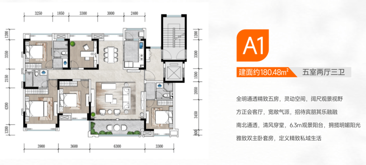 5.产品能打:146-180㎡纯改善户型,得房率高;45㎡超大共享厅+6.9m观景阳台,180㎡做五房双主卧套房,3.3-3.9m奢阔面宽,全景飘窗户户采光