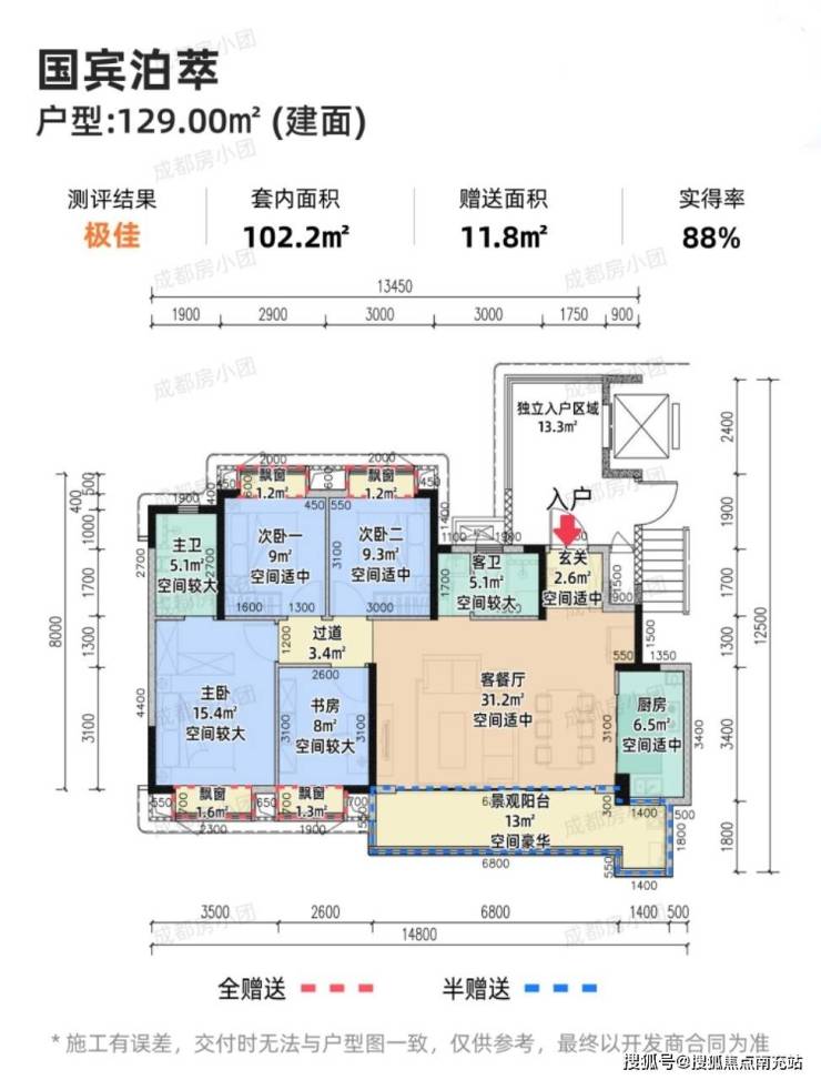 【方正实用】:该户型整体较为方正,空间利用率极高,有效减少了面积浪费,为居住者提供了更多实际可使用的空间,让每一寸空间都物尽其用。【板式结构】:采用1T2户的板式结构设计,搭配宽尺阳台,约8米的景观阳台,让您可以俯瞰窗外美景,享受舒适惬意的生活。【三房两卫设计】:户型内设有三间卧室,无论是温馨的三口之家,还是三世同堂的大家庭,都能满足居住需求。而且,居住者还能根据自身实际需求,将其中一间卧室灵活设置为书房、衣帽间等功能房,灵活性显著。主卫和客卫的合理设计,既方便家庭成员日常使用,又能充分保障主人生活的私密性。【横厅设计】:采用大横厅设计理念,客厅与餐厅的空间显得更加开阔,视觉上给人宽敞大气之感。同时,这种设计还大大增加了采光面和通风效果,使室内始终保持明亮通透。——【129㎡户型:套四双卫】——