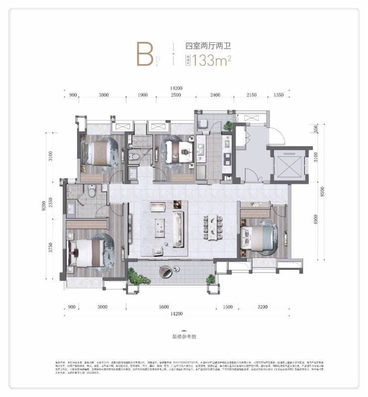 建面约133平套四