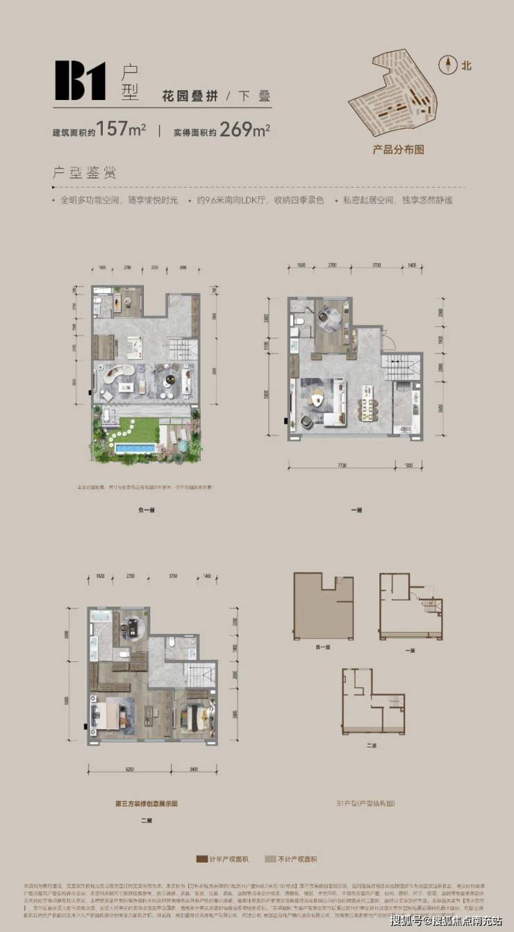 墅区空间的产品主义万科在造墅领域拥有深厚的经验积累。基于对别墅客群需求的深入调研,尤其是关注到置业客群年轻化的趋势,君悦云台在产品设计上进行了大胆创新。首先,君悦云台的建筑结构以几何模型拼接为灵感源泉,将楼栋最大限度地横向展开,开间可达约7.5至15米。这样的设计保证了起居厅拥有宽敞的尺度感与充足的采光度,尽显大气的院墅空间风范。再通过部分户型层层退台的巧妙结构设计,让每一户都能拥有不低于约20㎡的户外空间。在这里,业主可以实现院墅生活中有天有地、种花种草的美好愿景,充分满足不同客群对墅居生活的无限想象。例如建面约157㎡的花园下叠户型,实得面积约269㎡。该户型巧妙利用台地自然高差,打造下沉式花园庭院,使负一层成为全明空间。这里既可以用作双会客厅,满足业主社交需求;也能根据家庭实际需求,灵活转变为五房双主卧,同比350㎡以上的大平层,能够完美满足尺度、功能、庭院三合一的高端改善需求。