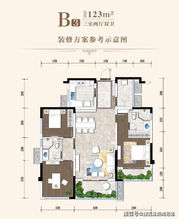· 105-123㎡三居:全明格局,双卫配置,6-7.2米景观阳台
