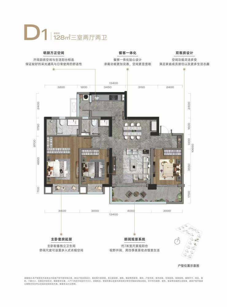 建面约128平套三