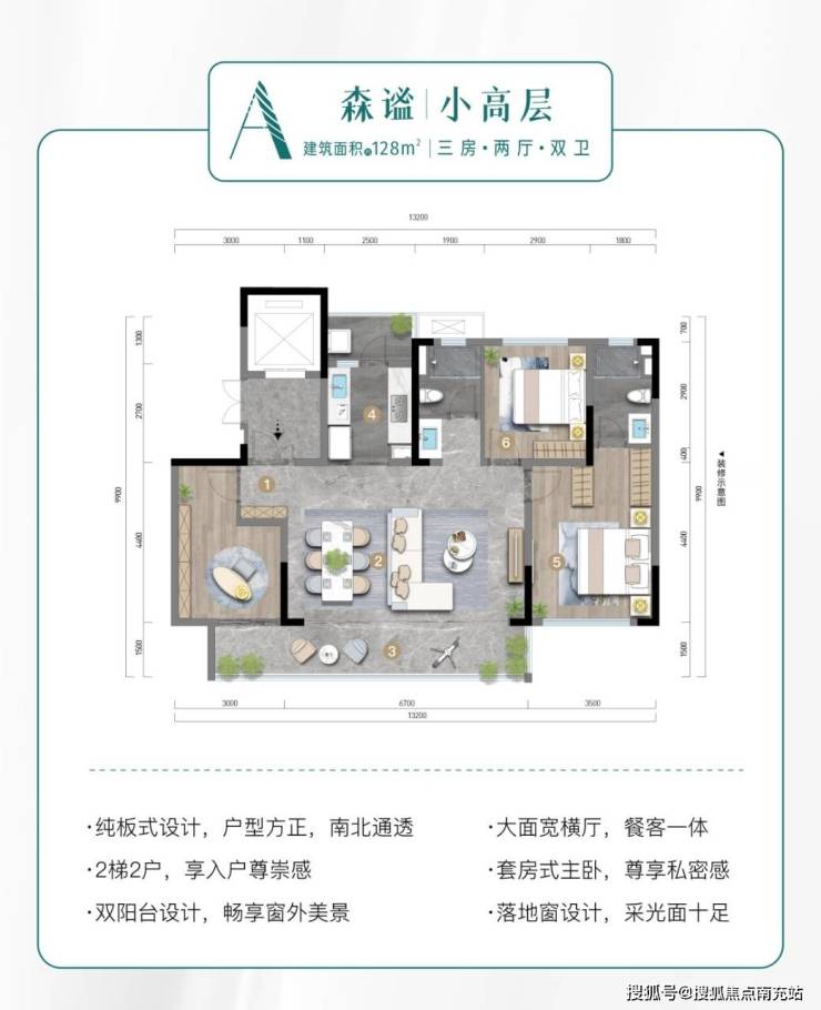 - 建面约128㎡板式瞰景小高,户型为三房两厅双卫。