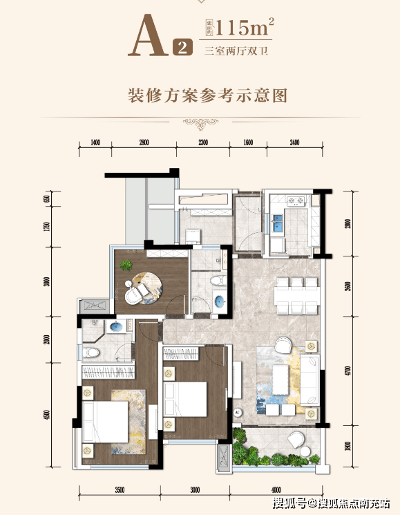 · 105-123㎡三居:全明格局,双卫配置,6-7.2米景观阳台