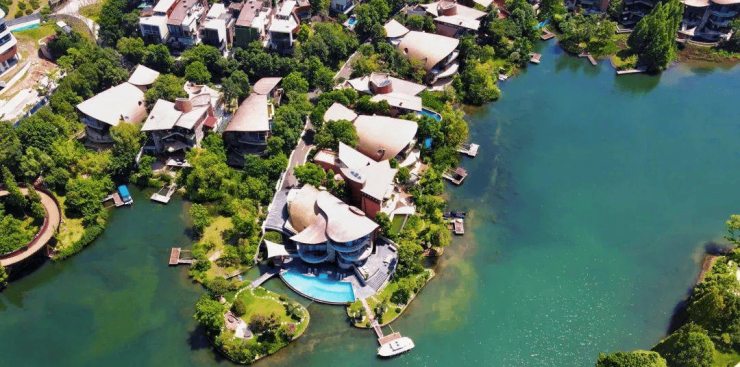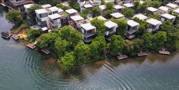 10. **黑钰岛**:黑钰岛历经九年精心雕琢,是全临湖独栋别墅。其建造概念源自【峡谷】,独特的设计打破了常规住宅的空间逻辑,宛如一座峡谷,由 2 - 3 个山体构成,中间透光,充满生机。项目位于起步区最中心位置,是纯独岛双临水设计,一岛一组团,绝版且不可复制。户户配备泳池和私家码头,实现水陆两栖直达。弧面墙体与平直屋顶,搭配外立面明暗不一的金属、石材、玻璃,营造出一种光影过渡的空间漫游感。该组团共有 46 栋建筑,面积在 590 - 828㎡之间,物业费为 6.0 元/㎡/月,交付标准为精装修。