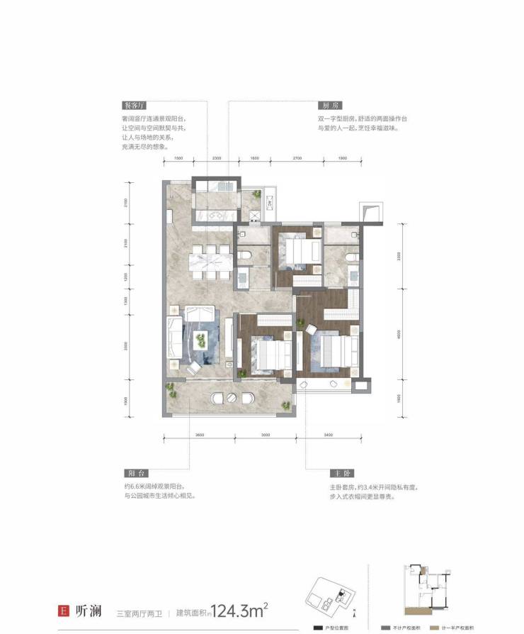 建面约124平套三