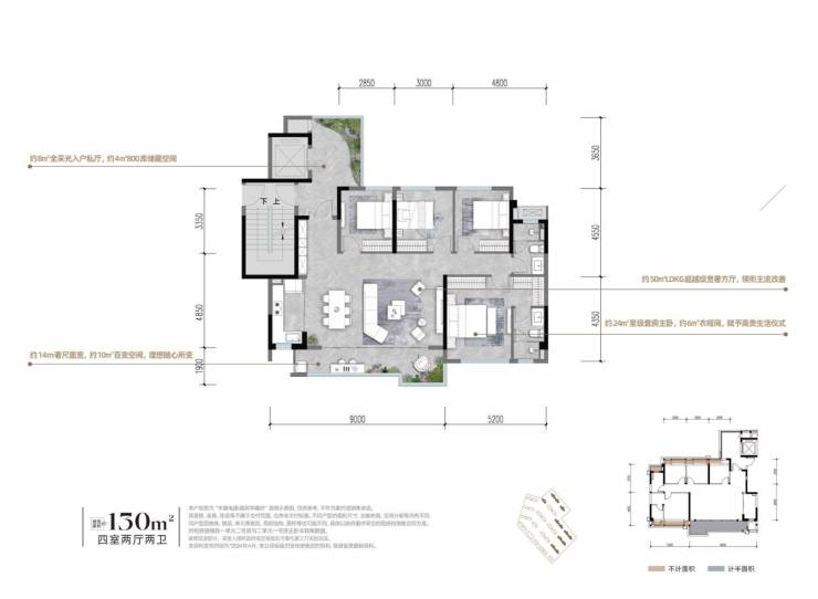 户型亮点:约8㎡全采光入户私厅,约4㎡800库储藏空间;约50㎡LDKG超越级宽奢方厅,领衔主流改善;约24㎡星级套房主卧,约6㎡衣帽间,赋予高贵生活仪式;约14m奢尺面宽,约10㎡百变空间,理想随心所变