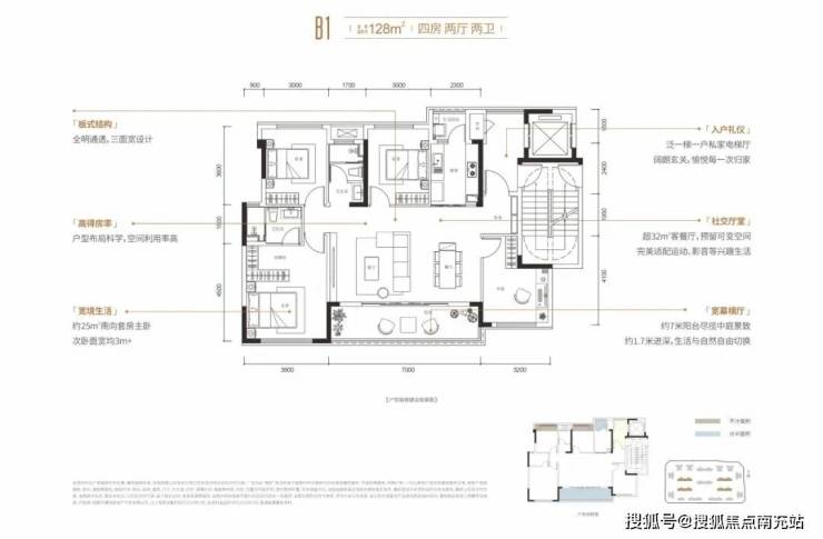 项目的所有户型公摊普遍较小,算上阳台、飘窗等赠送空间,整体实得面积均在90%以上,建面约128㎡的套四实得更是达到了约100%。