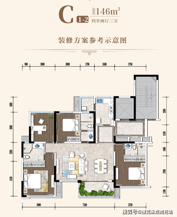 5. **146㎡套四两厅三卫**罕有的 3.2m 层高,使得格局大气开阔。约 7.1m 的超大双厅开间,大面宽设计延展无限风景。一梯一户,电梯入户,尽显阔绰。奢华三卫,双主卧设计,适合三代同堂,共享天伦之乐。