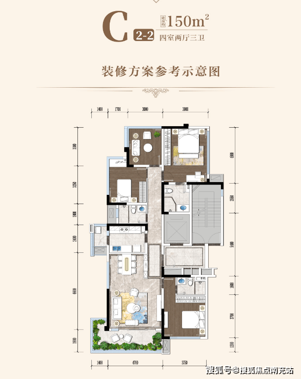 6. **150㎡套四两厅三卫**约 12㎡的超宽阔阳台,270°观景视角,城市繁华景象尽收眼底。同样拥有罕有的 3.2m 层高,格局大气开阔。餐客厅一体化,一梯一户设计,打造私密空间。