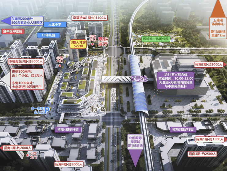 此外,双天桥+连廊,直接将5号线地铁与本案紧密相连,天音路以东十几万居民地铁通勤的最短路径就在这里。