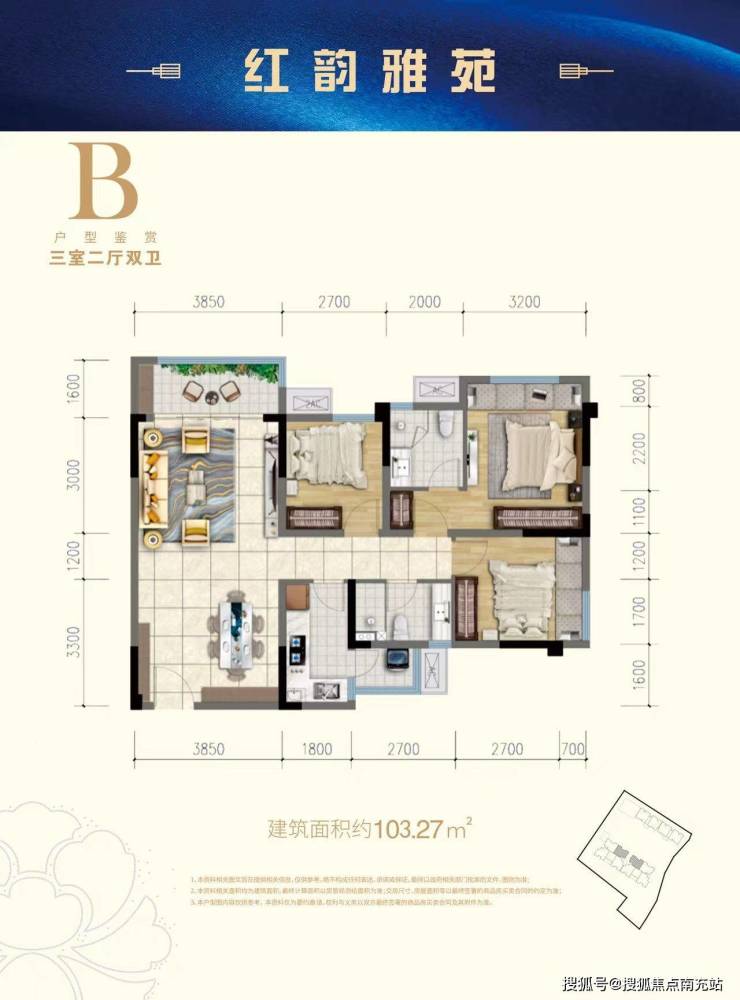 匠心户型品鉴———【103㎡精装三居室】———★ 产品亮点:该户型采用双卫设计,充分考量了家庭生活的便利性;客厅面宽达3.75米,宽敞明亮;配备2T4高效电梯,极大提高了出行效率,让居住既舒适又便利。