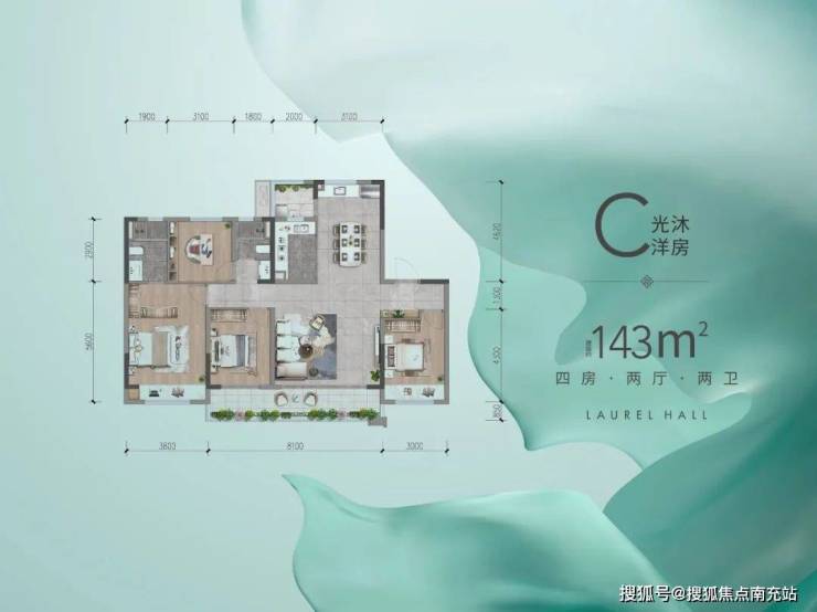 项目主打花园洋房产品,除五栋18层小高层采用2T2/2T4设计外,其余均为1T2/2T2纯板式洋房。主力户型涵盖103-143㎡,其中: