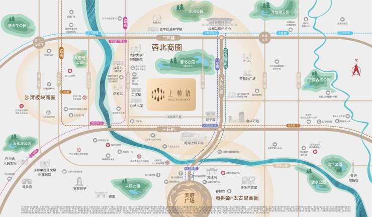 这里是未来城市生活的样板::蓉北商圈,国际枢纽型战略门户、三大城市级商圈之一,老成都与新国际于此接轨,下楼即可步入“人北中央商务区”的繁华与便捷,推窗即见“蓉北公园”的葱郁与生机。工作与生活、奋斗与休憩,在此找到最佳平衡点。