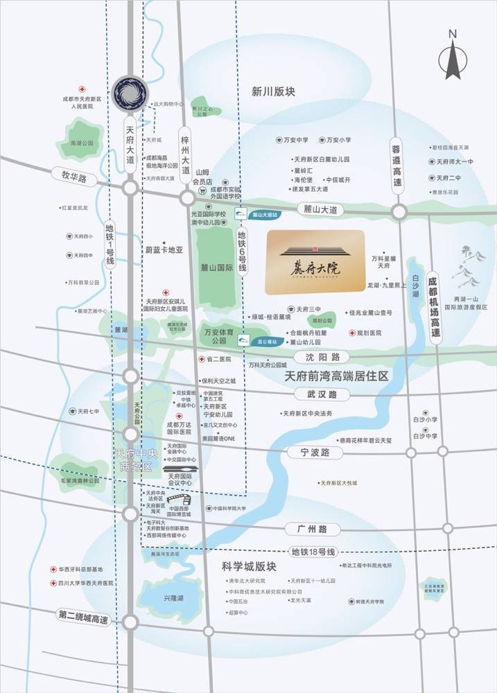 麓府大院位于天府前湾的核心腹地,北界麓山大道,南靠武汉路,西部接梓州大道,东侧紧邻利州大道。这一位置恰好处于高新区新川之心科技园板块和天府CBD版块(秦皇寺、兴隆湖)的驳接带,是“公园+居住”理念的核心体现。项目周边被三大产业核心区环绕,成为天府新区首屈一指的“高端宜居走廊”。