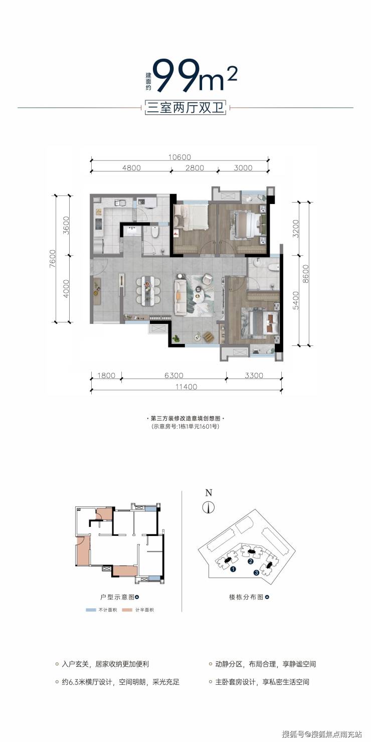 · 99㎡阔绰三居:A4户型,3室2厅2卫的设计