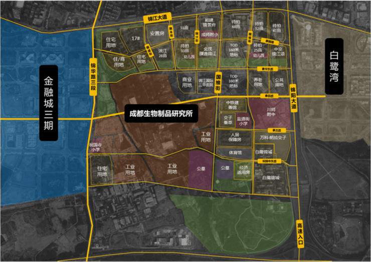 现在它是锦江大道沿线最主要的住宅供应板块,总规划面积约4000亩,板块大火的原因有两个,一是内部有大片的住宅用地,白板上好做规划,二是它夹在交子金融商圈与白鹭湾科技生态园两大高端产业集群之间,左边是金三,右边是白鹭湾,未来可以接收到两个板块的价值辐射。