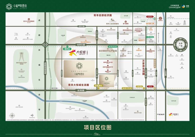 交通配套:三横三纵三地铁,三横:日月大道/光华大道/光华八线,三纵:西3环/西3.5环/4环绕城高速,三轨道:4号线/9号线/13号线。