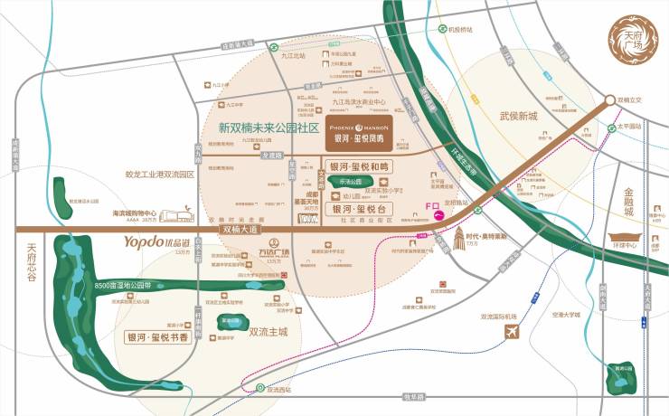 双楠大道由东向西串联起成都大悦城、武侯吾悦广场、武侯星悦荟、武侯山姆会员店、星荟天地等超百万方城市级商