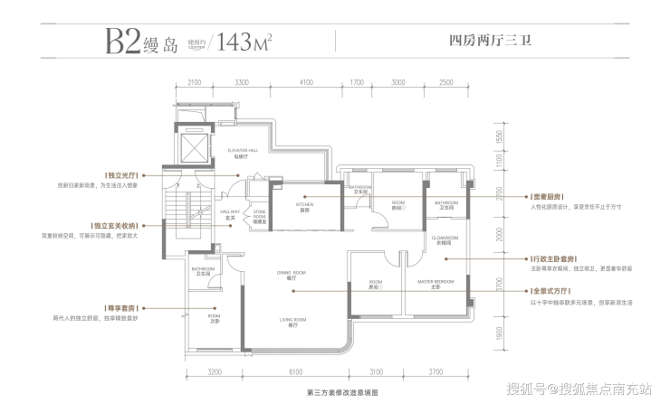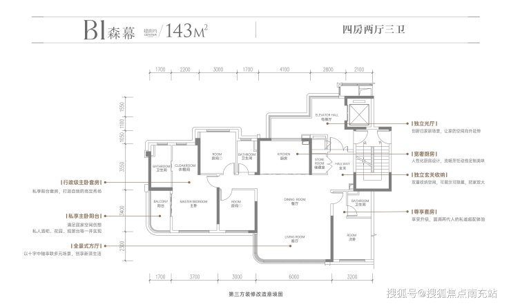 2. 143㎡套四三卫(B1户型):横厅阔尺,双套房尊享