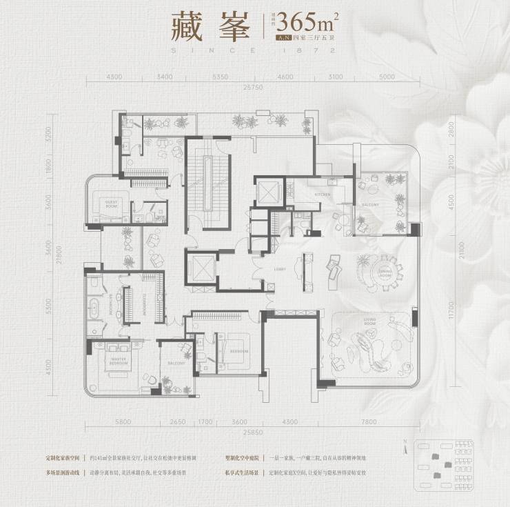 5.户型设计优越:有建面约245-365㎡的大平层和仅22套的定制合院。大平层户型设计豪华,如私家电梯、独立玄关、超100㎡家族社交厅等配置齐全,还通过奇数层偶数层差异化设置,引入两层通高的空中院馆“光合庭院”,实现270度景观视野。