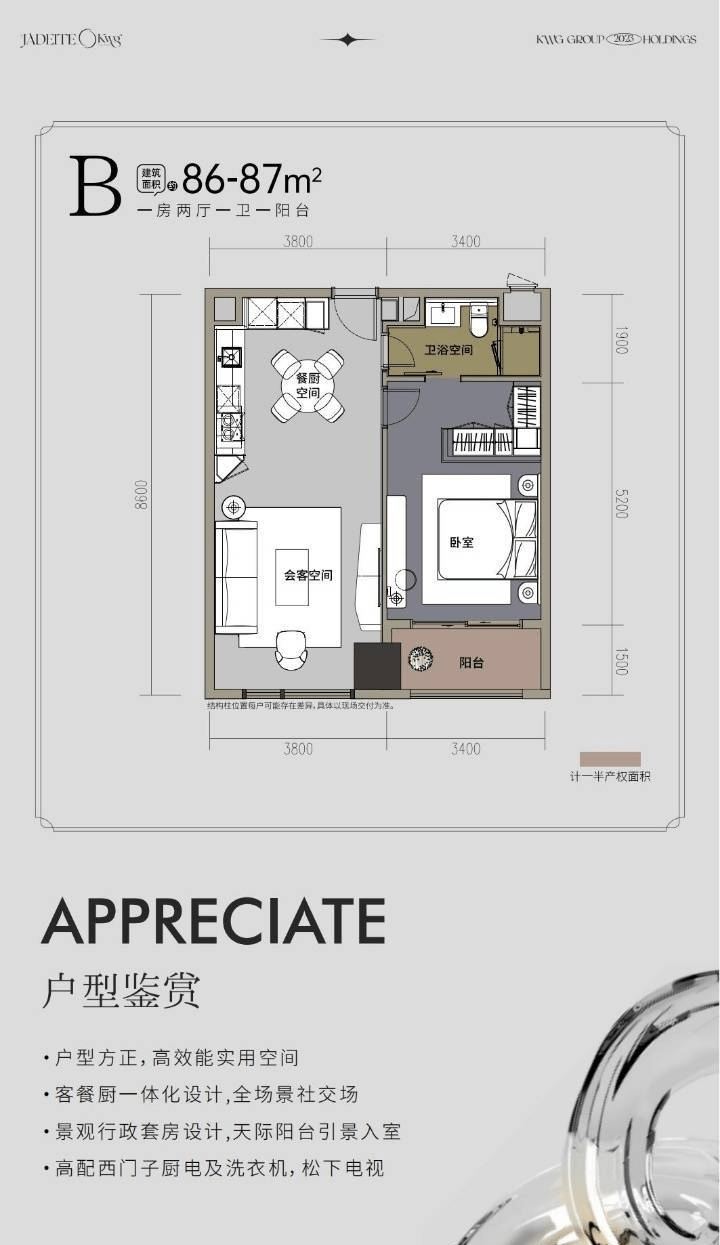 在建筑风格与装修细节上,合景J300同样令人惊艳。它采用港式现代奢雅风格,外观简约大气,内部装修更是精雕细琢。项目拥有超208道精装高奢工艺,全屋采用西门子、弗兰卡、松下等全进口品牌家电及软装,每一处细节都散发着奢华与品质的气息。户型设计上,全成都罕有的100%全套房户型十分吸睛,超90%的户型带有天际观景阳台,推窗便能将交子大道的繁华尽收眼底,仿佛让人置身于城市的云端,享受着独有的惬意与美好。 【户型图品鉴】