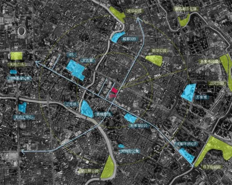项目周边,历史遗迹与现代商业交相辉映。不远处的大慈寺被誉为“震旦第一丛林”,交子巷则诞生了世界上最早的纸币——交子,成为中国金融史上的重要里程碑。再往东,九眼桥和合江亭等历史建筑,见证了成都千年的繁华与变迁。而现代商业的繁荣同样不容小觑,太古里、IFS等高端购物中心近在咫尺,让这里成为成都时尚与潮流的聚集地。