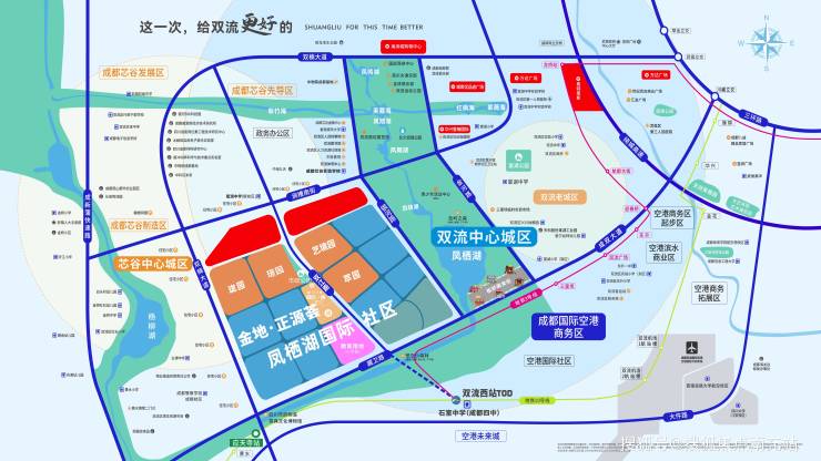 3. **社区配套与服务** - **商业配套**:规划建设13.5万㎡旗舰商业综合体,未来将引入星级酒店、商业步行街、商务办公等多元业态。社区内配备幼儿园及小学教育资源。 - **物业服务**:由国内十强物业企业金地物业提供专业服务,为业主打造舒适安心的居住环境。## 品牌实力解析1. **金地集团:中国地产领军企业**作为"零踩线"千亿级绿档房企,金地集团财务稳健,获得国际三大信用机构稳定评级。旗下金地商置位列全国产城发展商前三甲,在产城融合领域表现卓越。2. **正源企业:区域深耕专家**正源企业深耕城市核心区域30年,凭借卓越的项目品质,荣获2020品质标杆楼盘运营商、四川品质楼盘、2021伦敦杰出地产奖等多项殊荣。## 区位价值分析项目位于成都芯谷中心城区与双流中心城区交汇处,占据双城核心区位。地处凤栖湖国际社区,作为双流品质宜居带门户,坐拥千亿产业发展主轴优势。周边环绕万亩公园湖景,距离凤栖湖仅约750米,自然环境优越。