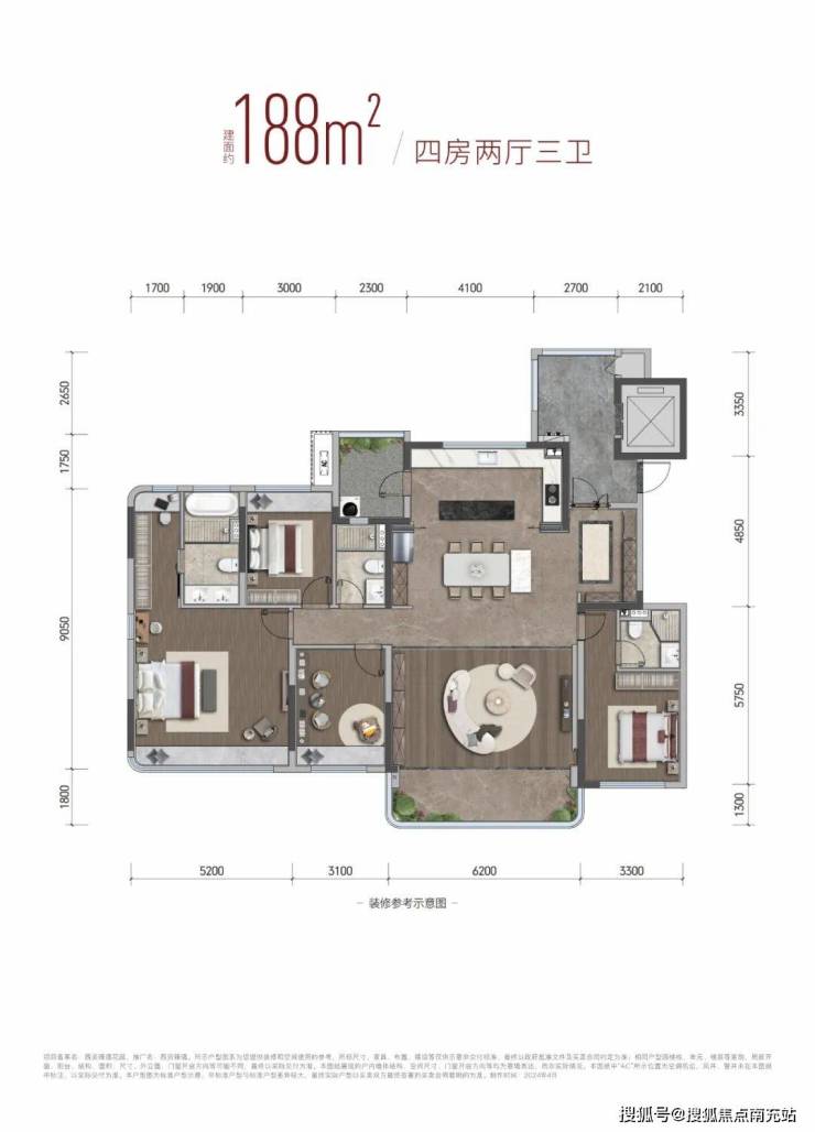 建面约188㎡这个户型,主景观面宽大约17.8米,和建面约225㎡户型一样都采用双套房布局,呈4开间设计,包括三间卧室和一个独立大客厅。