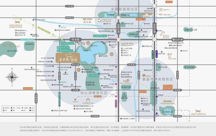 保利怡心和颂总占地面积约135亩,项目内部绿树成荫,景色宜人。小区内规划了丰富的绿地景观,包括沿湖2.7公里的湖岸线、1000亩的湖滨公园以及450亩的辽阔湖域景观,为业主提供了一个天然的大氧吧。此外,项目还被天府体育公园、跌水公园、怡心城市公园等七大生态公园环绕,让业主在享受城市生活的同时,也能亲近自然,感受大自然的宁静与美好。
